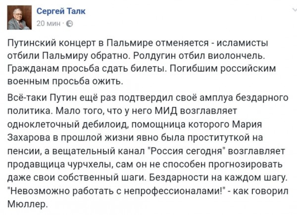 вот тебе пример, армия которую все бояться и хотя б там присоединиться кто то ,гордость ВДВ:https://youtu.be/CaM6KQze92U вот кто снабжает ИГИЛ оружием https://youtu.be/iXvDsP4Zq_Q высказывания Генштаба России о героической битве https://youtu.be/yBohnY3HgE4 обычно после такого люди стреляются а не рассказывают о героическом подвиге при этом кинув своих в плену и на поле боя "Командир батальона 56-й десантно-штурмовой бригады Санал Санчиров был переброшен в Пальмиру, чтобы остановить наступление ИГИЛ в составе российского подразделения. Но боевики выбили россиян, майор Санчиров убит. Факт гибели и обстоятельства происшедшего сообщила семья майора. Ну вот, и никакие ВКС, экипировка и полное превосходство во всех силах и средствах не спасли Санчирова. Банковские карточки, борщ и детективы Чейза на базе в Пальмире оставили во время бегства российские десантники, но уйти удалось не всем",«Город окружен, частично захвачен, идет попытка атаковать боевиков с воздуха — происходят налеты авиации и вертолетов, но пока безрезультатно. Российская военная база в Пальмире серьезно пострадала. ИГИЛ захватил авиабазу Тияс Т-4 восточнее Пальмиры (ту авиабазу, наши 4 вертолета и два самолета), на базе уничтожен сирийский МиГ-23, который не сумел взлететь. В остальном ситуация прежняя. У правительства нет сил, чтобы провести контрнаступление». Вот высказывания нормальны людей