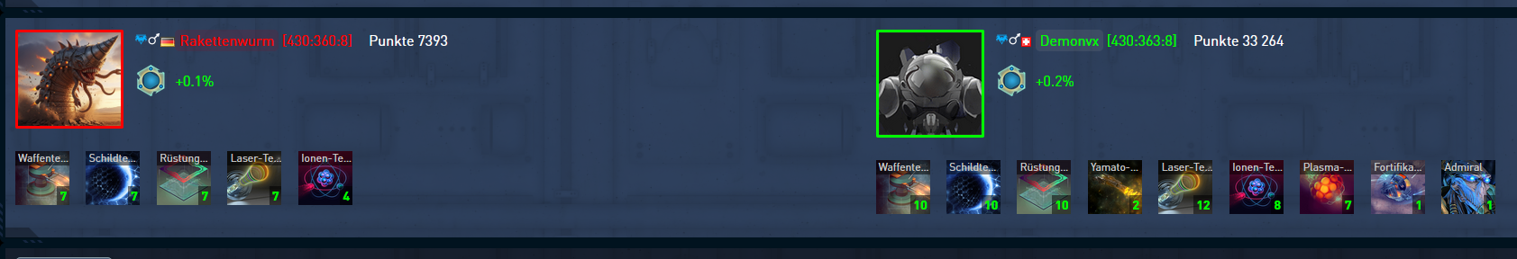 Fullinger, Na, das mit Schlaumeier war wirklich nicht nett - zudem das ein sehr kampferprobter und sehr erfahrener Spieler ist, der die Spielfunktionen und Spielmechanik zur Gänze kennt (sich tatsächlich hier in dem Spiel wesentlich besser sich auskennt als du) - schau mal ganz in Ruhe sein Profil an und lese mal alle Daten raus (wann registriert, wie viel Kampferfahrung, die Raubzugleveln sagen aus wie viel er schon an Gas für Flüge eingesetzt hat, die Auszeichnungen sagen auch viel über seine Spielweise aus, ect. ect...) bevor du jemanden eine unpassende Antwort patzig gibst.... Also ich schaue mir immer die Profile an, bevor ich jemanden anspreche...