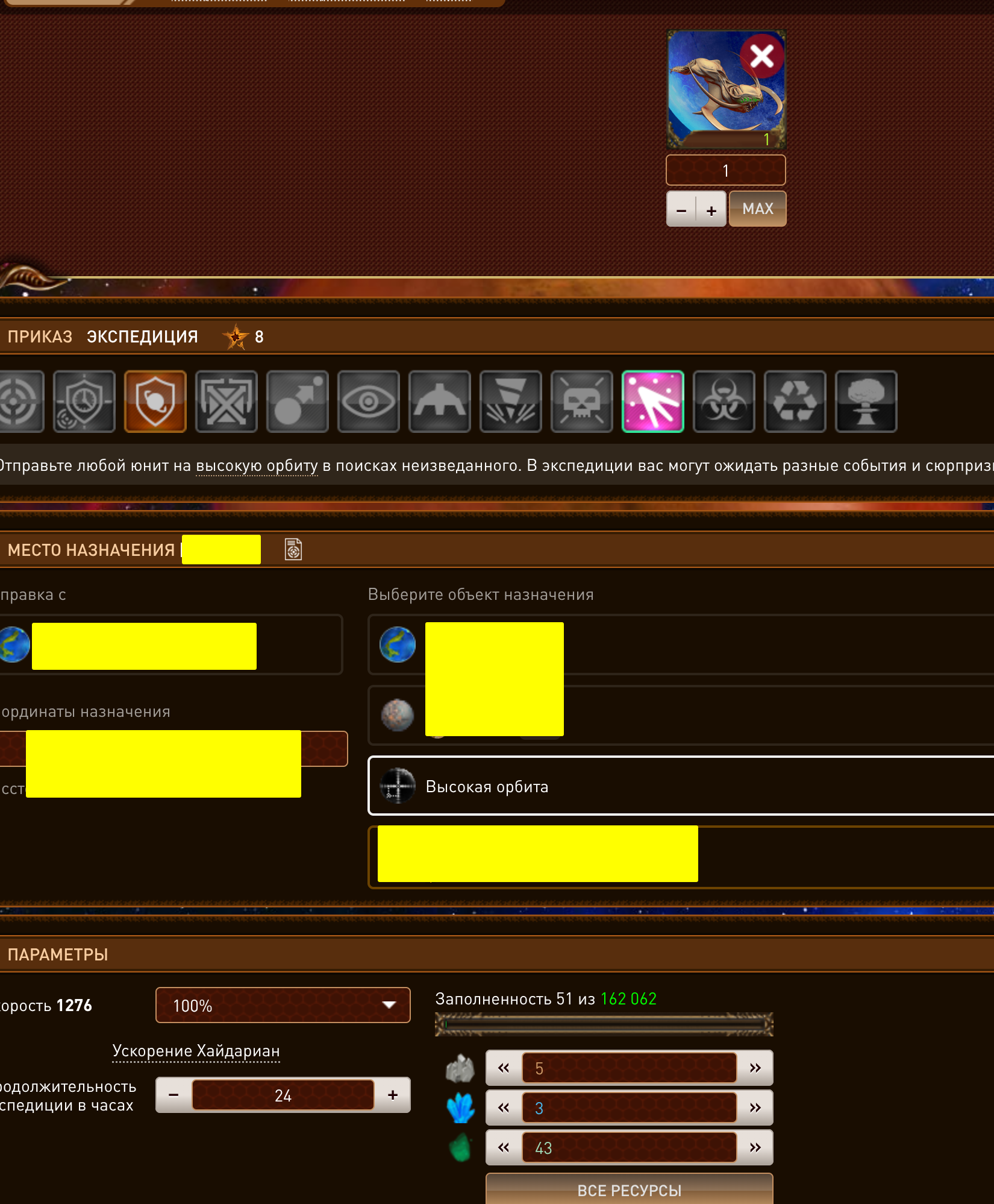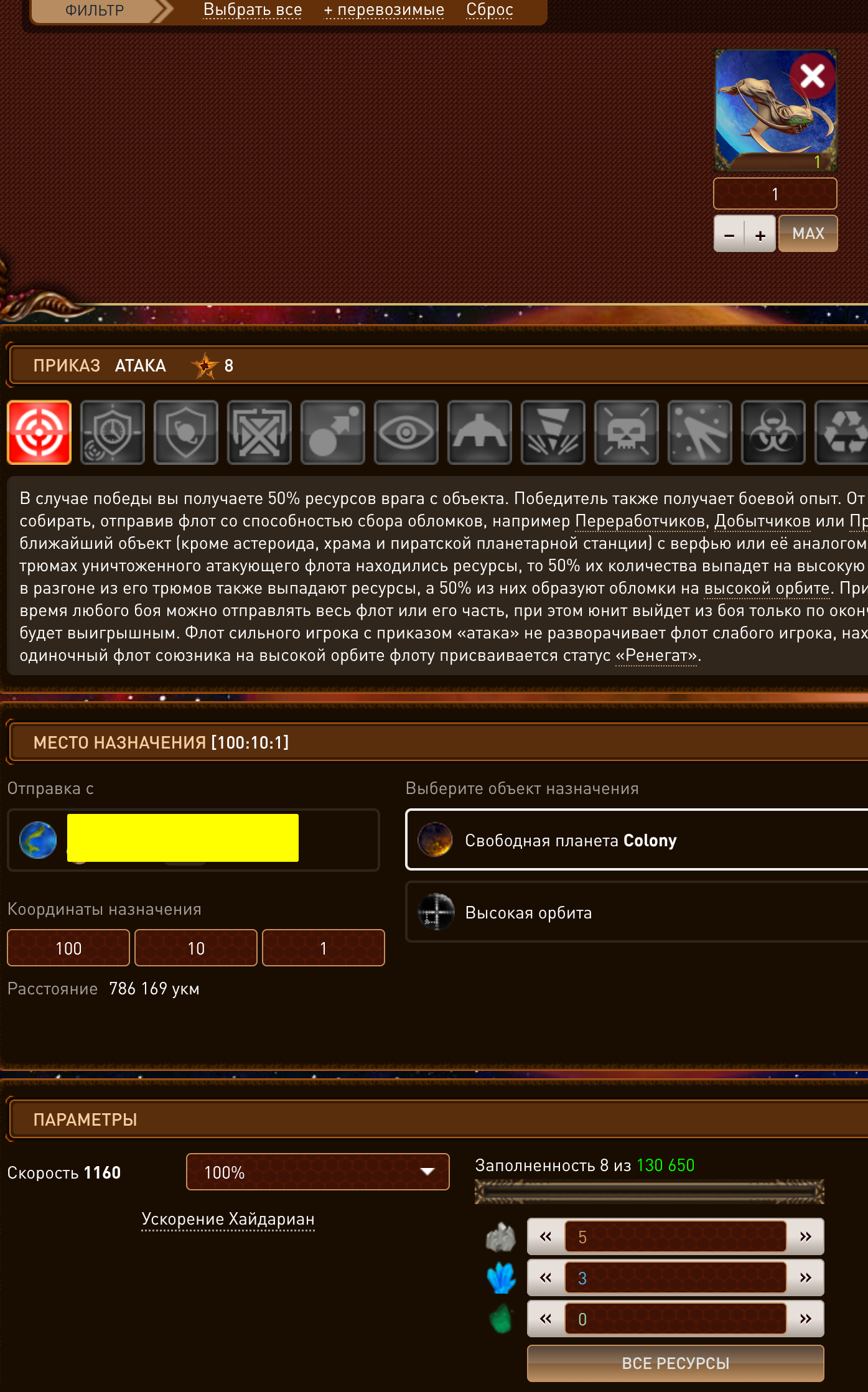 После нажатия на неё, вы перейдёте на страницу отправки флота, где сможете выбрать нужное количество королев и ресурсов, и отправить на миссию