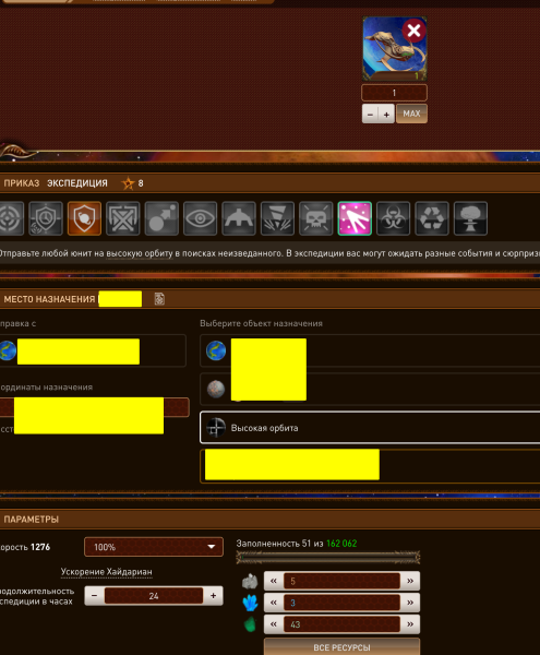 After clicking it, you will be taken to the fleet dispatch page, where you can select the desired number of Queens and resources, and send them to execute an order.