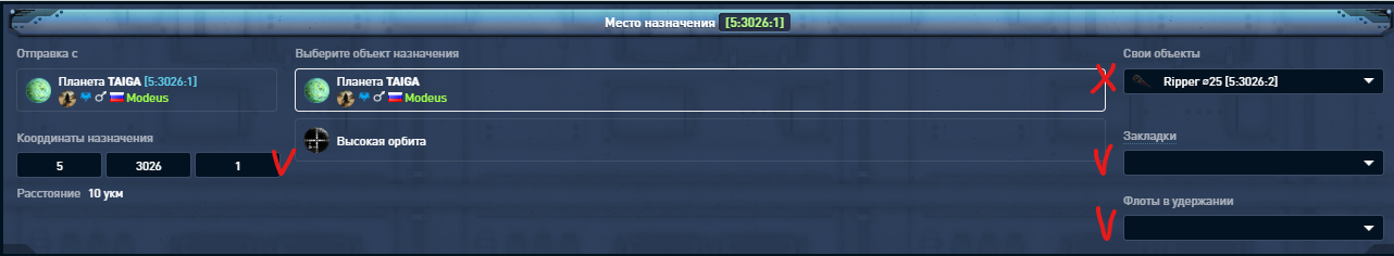 Список "Свои объекты" во вкладке флоты не меняет пункт назначения. Ручной ввод координат и списки закладок, флотов в удержании работают.