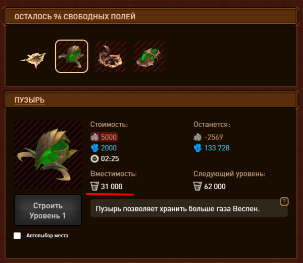 Описание: Пузырь на нулевом уровне показывает что имеется вместимость 31000, когда ее нет и на 1 уровне пузыря вместимость 62000