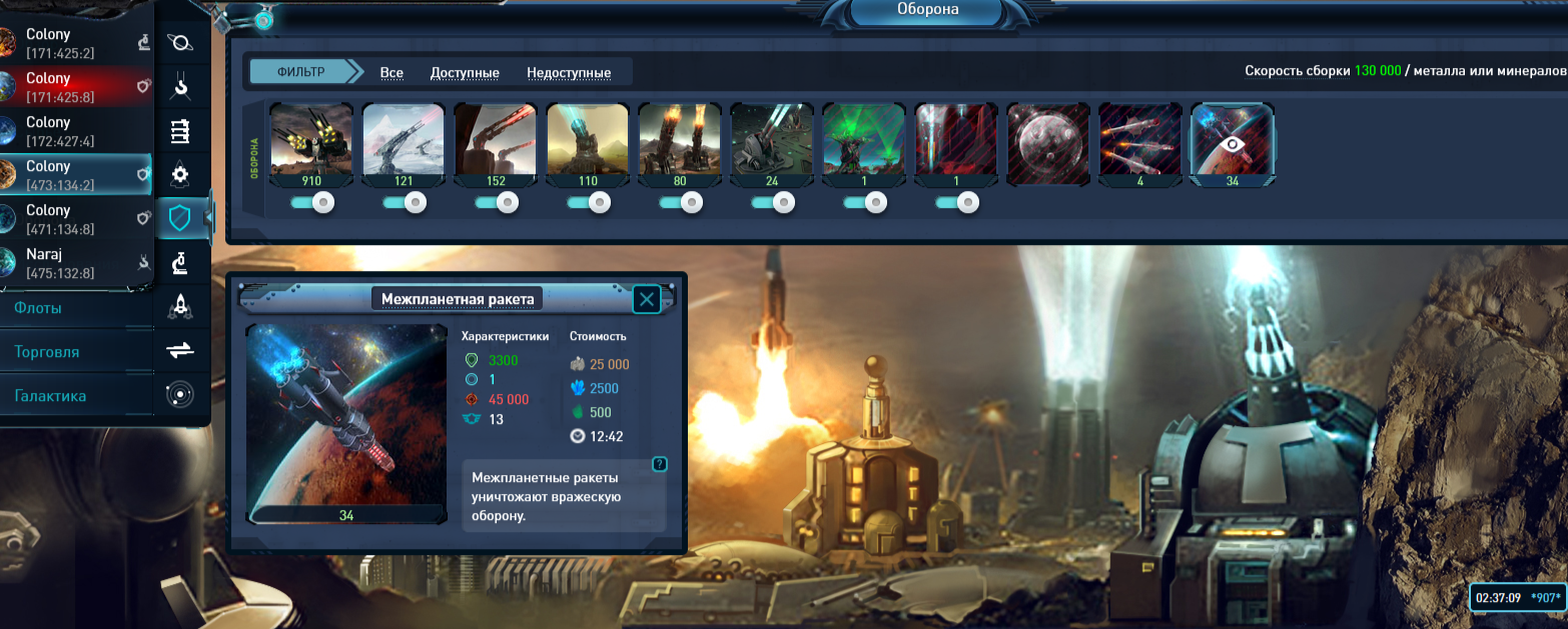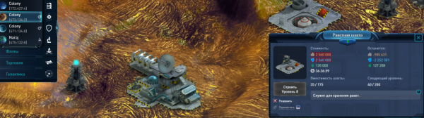 Описание:ракетная шахта 7 уровня вместимость 35 межпланетных и 175 ракет перехватчиков при постройке межпланетных ракет строится 34 хотя ресурсов хватает на 35