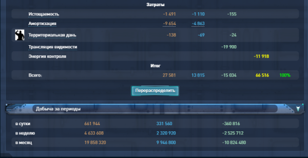Общий расход на трансляцию видимости можно увидеть в меню «Сырьё»: