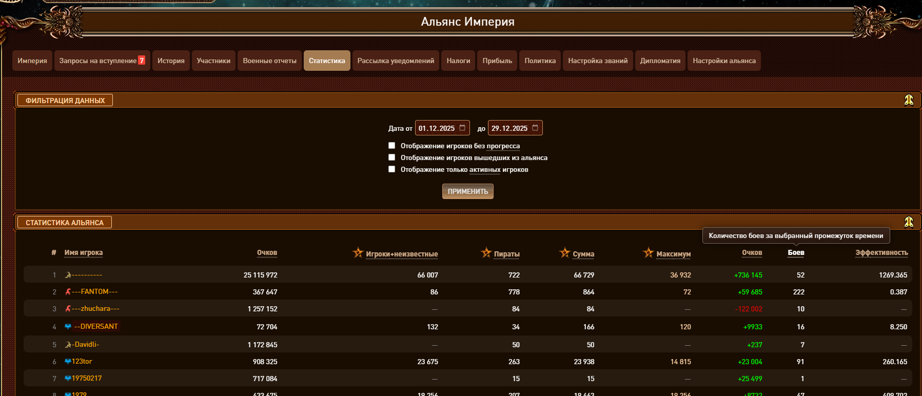 Баг в разделе статистика альянса, не работает сортировка