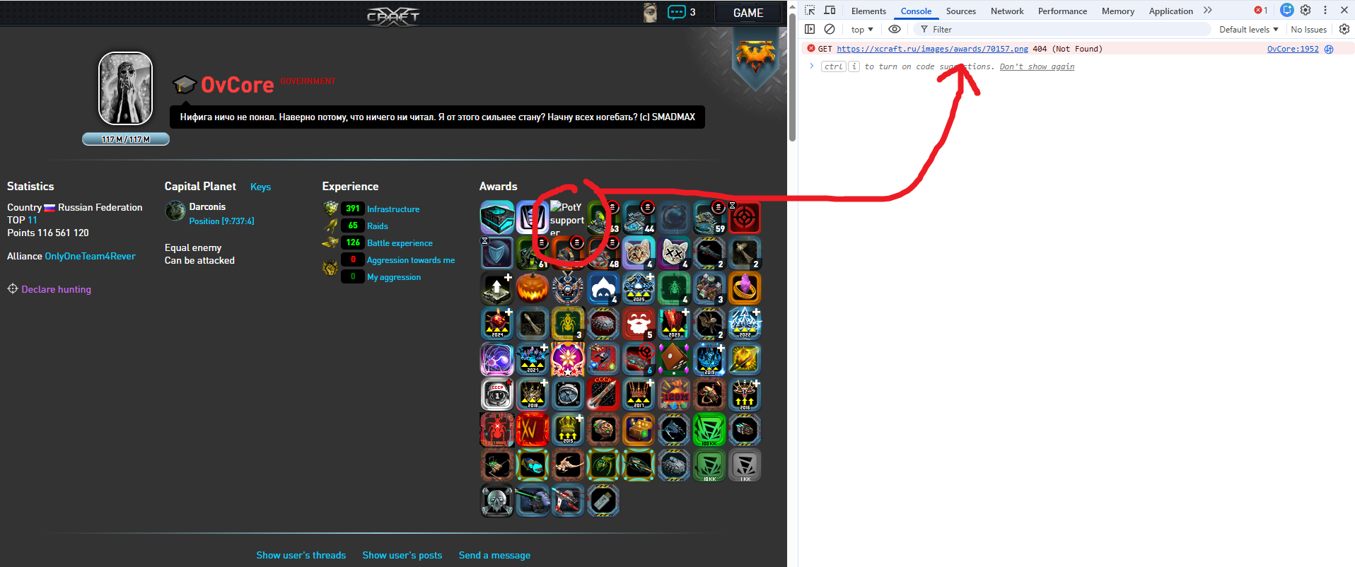 An award image fails to load due to a missing resource on the server. The browser returns a 404 (Not Found) error for the image URL, resulting in a broken image on the user profile page.