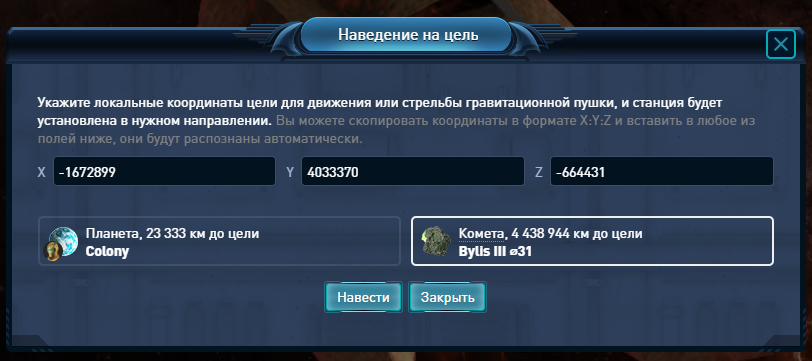 Гравипушка > Направление > Наведение на цель > выбрать комету Bylis III