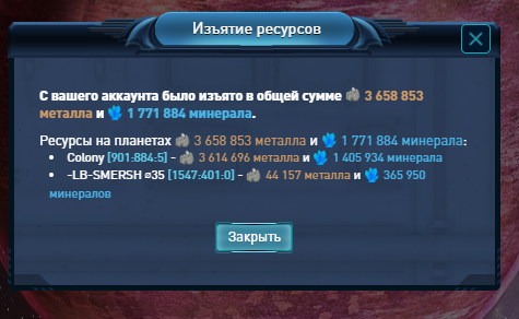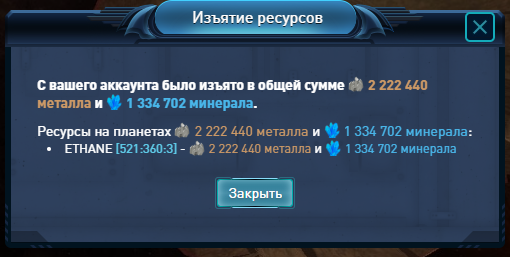 С вашего аккаунта было изъято в общей сумме 84 356 856 металла, 97 201 340 минералов и 84 532 148 газа веспен. Этот типа багованный флот снес на моих,\\не чужих\\ планках и ОПС все планетоиды,лампочки, ресурсы и оборону. Флот пиратов летел постоянно сразу на все в сумашедшем количестве \\.Летел в атаку и сразу же одновременно на сбор ресов.что бы нельзя было собрать. Если пытаешься собрать еще и дополнительно сразу всех видов до десятков тысяч летело в атаку. разных наименований. И получается,что если пытаешься защититься НА СВОИХ ОБЪЕКТАХ и кого то посбивать -это наказание? Наказывать надо админов,кто это придумал и сделал. Интересно, есть у них хоть какая-то одна причина объяснить в чем вина игрока? и как игрок должен заглянуть в мозговую коробку этим чертям и бармалеям, что бы понять, что это баг.Не разовый а в течении всего дня.Баг у них головах. И кто вернет игрокам , то ?что эти баги посносили ирокам?